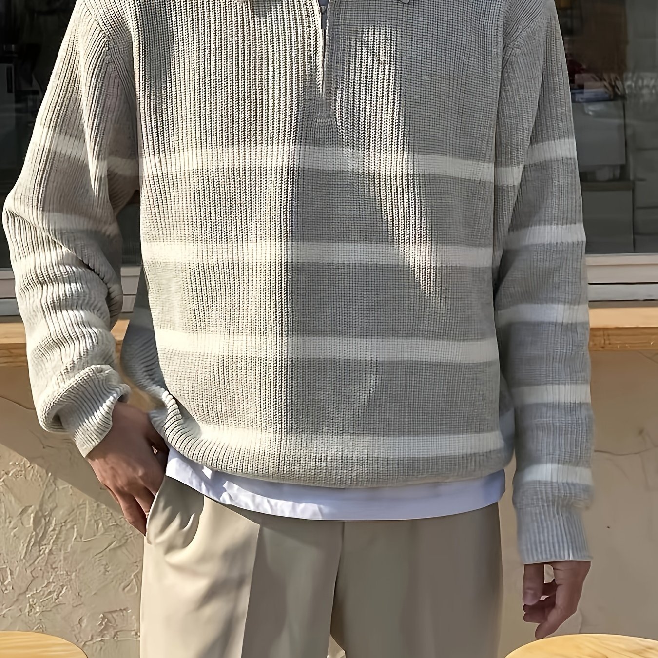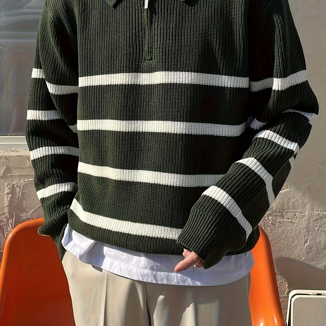mens stylish stripe pattern knitted pullover casual breathable long sleeve lapel half zipper top for city walk street hanging outdoor activities details 10