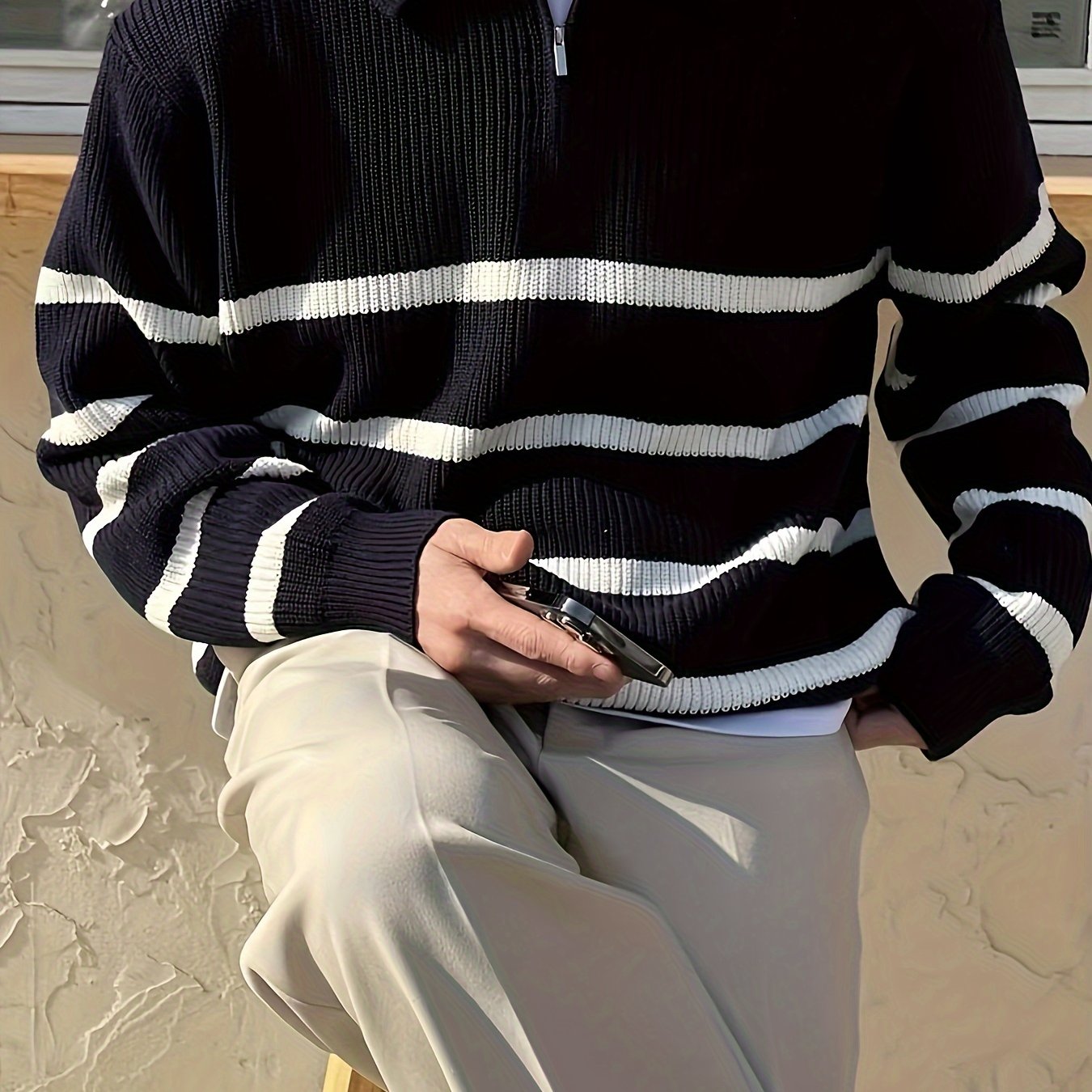 Men’s Stylish Stripe Pattern Knitted Pullover – Casual Breathable Long Sleeve Half Zipper Top