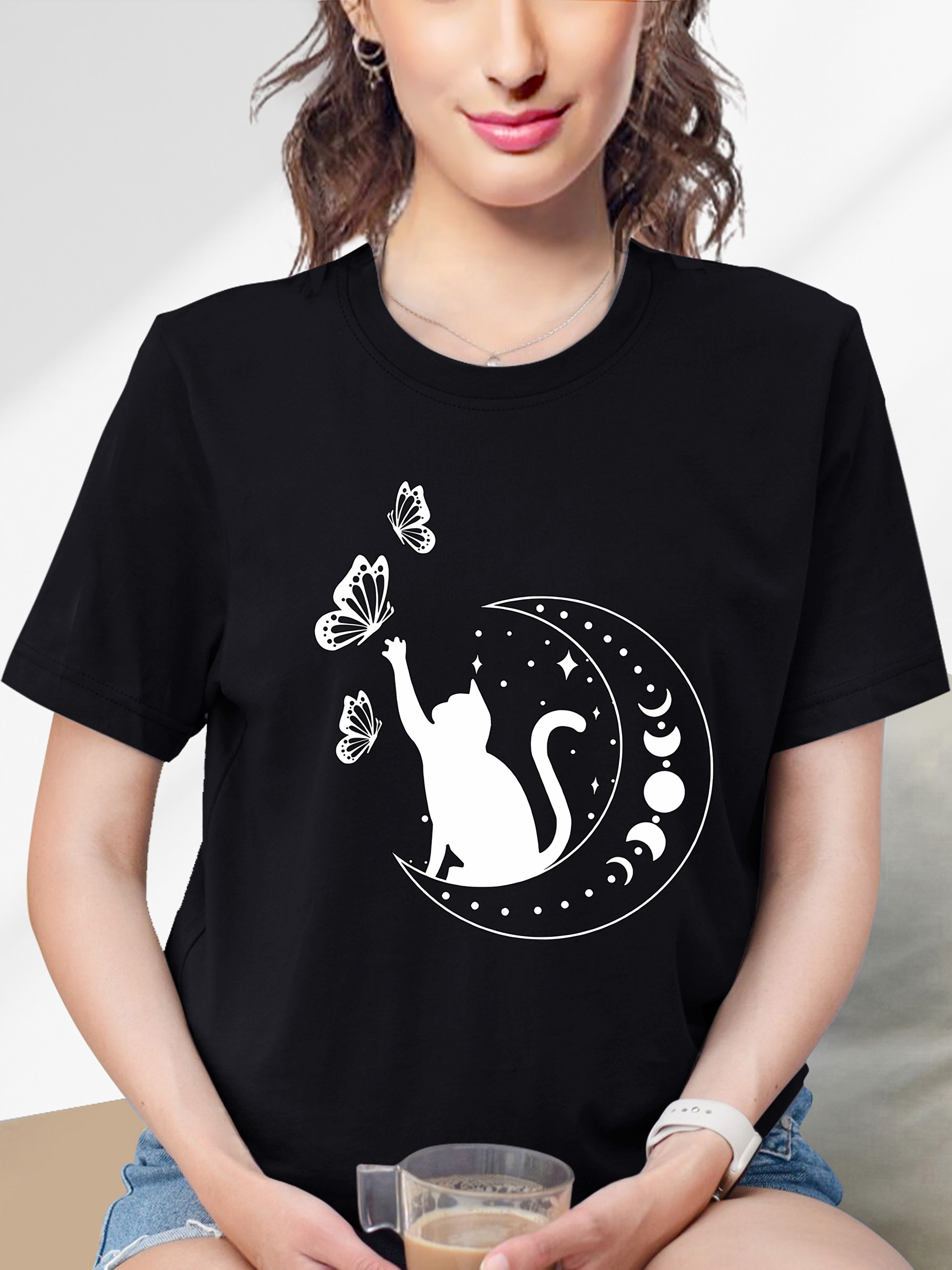 Cat & Butterfly & Moon Graphic Causal Sports T-shirt, Short Sleeves Round Neck Workout Tops, Women’s Activewear